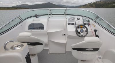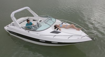Parabrisas em estrutura de alumínio com vidro e porta de acesso a proa;