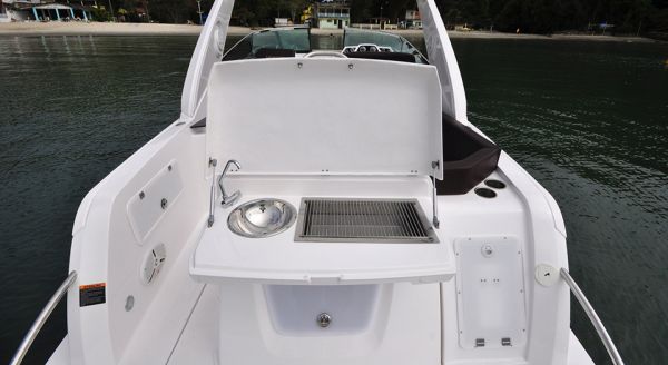 Área gourmet na popa com pia com cuba em aço inox, torneira com regulagem e tampa em fibra;